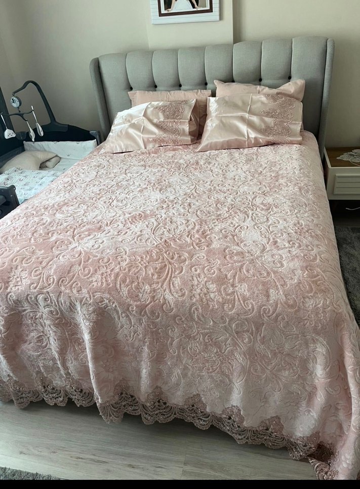 Pastel pudra pembesi renginde, nakışlı desenlere ve dantel uç detayına sahip yumuşak dokulu yatak örtüsü.