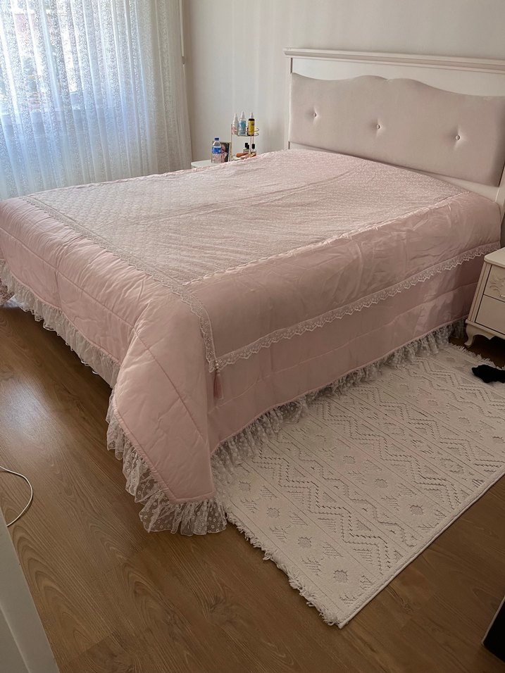 Pastel pudra pembesi yatak örtüsü, ince nakış ve dantel detaylarıyla yatak odasına zarif bir dokunuş katıyor. Kapitoneli ve dolguludur istikbal markadır hiç kullanılmadı kutulu bir şekilde duruyordu