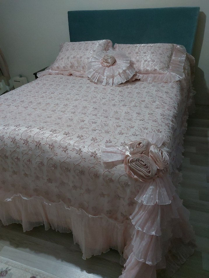 Nakışlı ve fırfırlı kenarlarıyla pastel pudra pembe yatak örtüsü, yatak odanıza zarif ve yumuşak bir dokunuş katıyor.