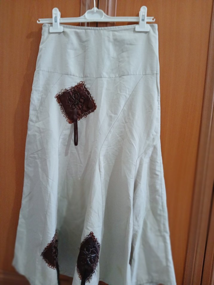 Yumuşak keten kumaştan, bol kesim, nakışlı ve püsküllü bohem tarzda bej uzun etek.