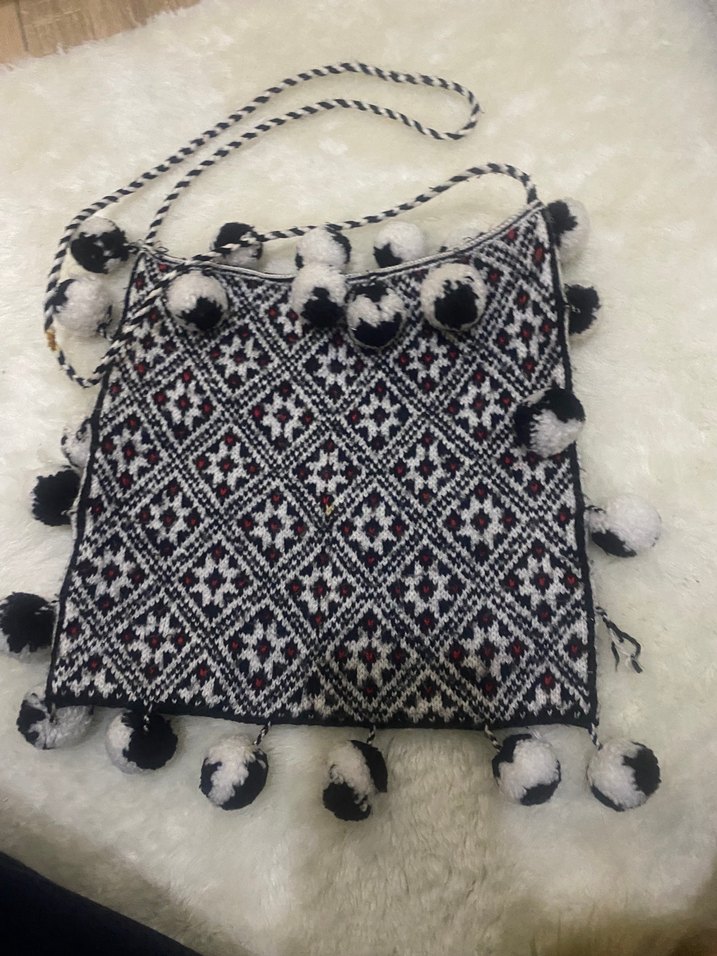Nakışlı tekstil malzemeden yapılmış, koyu çok renkli desenli, püsküllü bohem tarzda kadın çantası. Geleneksel şekle ve örgülü askıya sahiptir.
