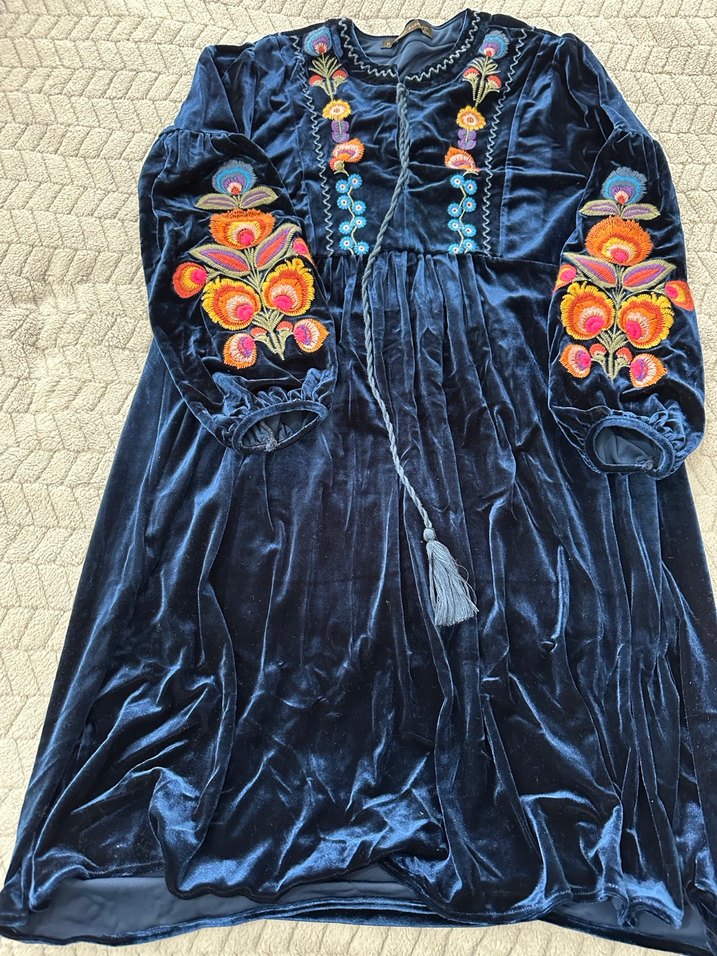 Rahat kesimli, koyu mavi elbise, ön ve kollarda renkli nakışlı çiçek desenleri ve püsküllerle süslenmiştir, yumuşak kumaştan yapılmıştır.