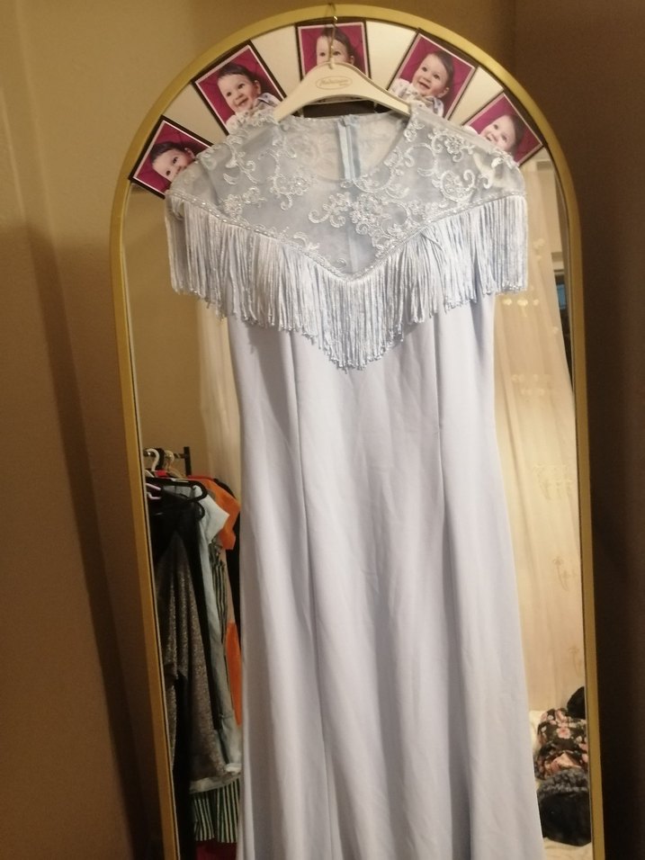 V yaka, kısa kollu, bol kesim beyaz uzun elbise. Bebe mavi nakışlı drapeli ve püsküllü detaylarıyla bohem düğün tarzı için uygun.