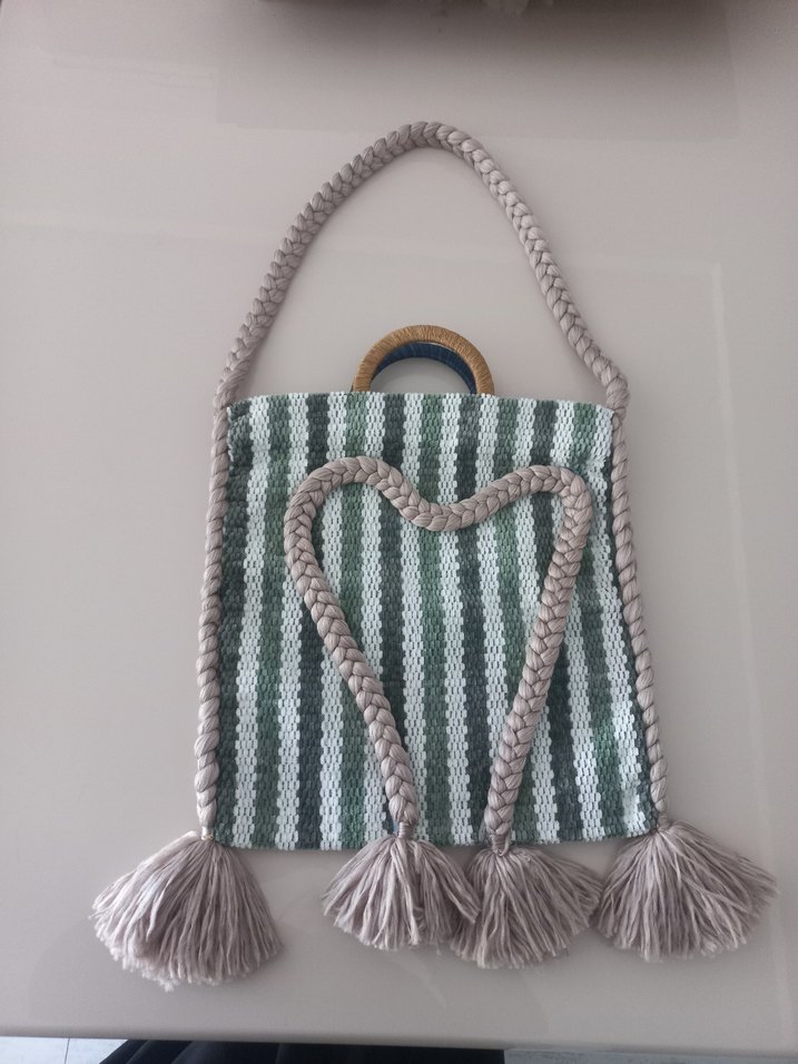 Bohem tarzda, nakışlı desenli ve püsküllü örgü kadın çantası. Gri ve yeşil çizgili, ahşap saplı, günlük kullanıma uygun. marka temsili