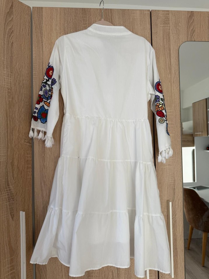 Nakışlı kolları ve püskül detayları olan beyaz pamuklu, uzun ve bol kesim elbise. Uzun kollu ve V yakalı, bohem tarz için uygun.