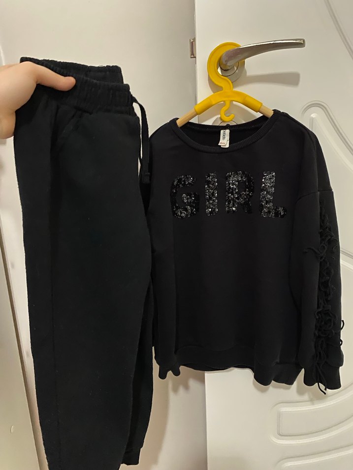 5-6 yaş Siyah renkte, nakış detaylı, uzun kollu, bisiklet yaka kız çocuk iki iplik eşofman takımı. Rahat ve salaş kesimle günlük kullanım için uygundur.