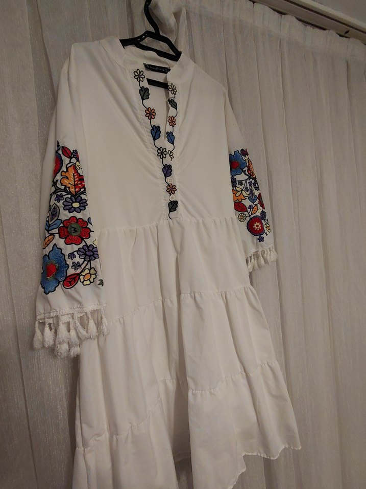 Pamuklu, uzun ve bol kesim hamile tunik. V yaka ve uzun kollu, kollar ve yakada renkli nakışlar ve püsküllerle bohem tarzda. Günlük kullanım için uygun.