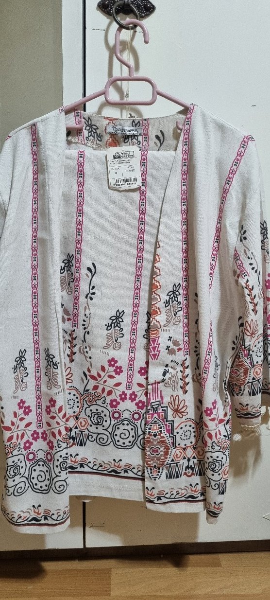 Nakışlı desenlere ve püsküllere sahip, uzun ve bol kesim kadın kimono. Tekstil kumaştan, beyaz renkte, tekne yaka ve uzun kollu, bohem tarz için uygun. ürün çok güzel biraz kilo aldığım için kullanamadım S M beden uyumlu