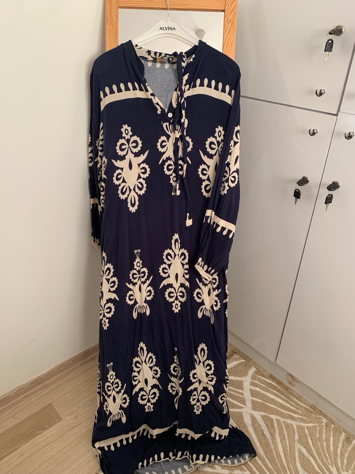 Nakış detaylı ve püsküllü, bol kesim uzun mavi elbise. V yaka ve uzun kollu, bohem tarzı için uygundur.