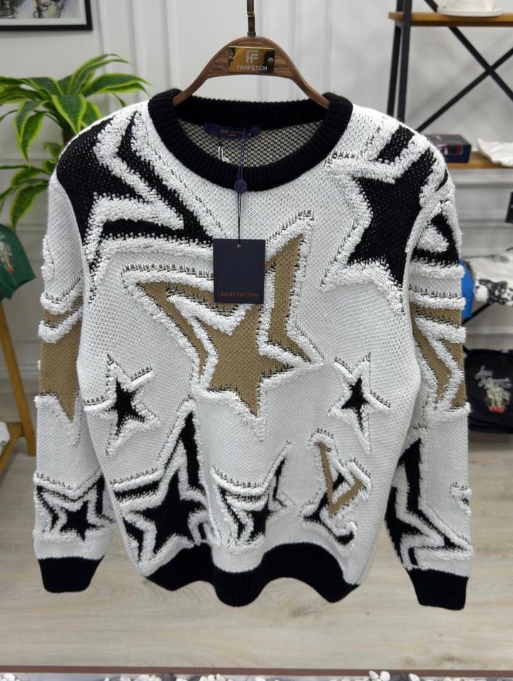 Nakışlı yıldız desenli, beyaz, gri ve siyah renklerde, bol kesim uzun kollu erkek triko kazak. Yuvarlak yaka ve normal boyda, günlük rahat kullanım için uygun. ⭐
