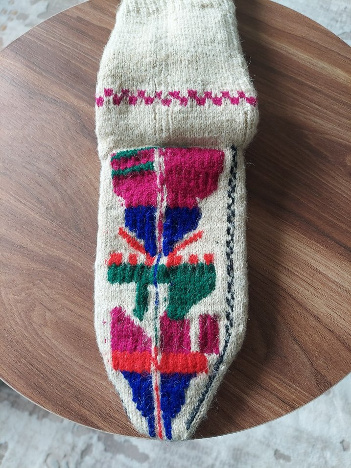 Nakışlı desenlere sahip renkli örme bayan çorabı, sıcak ve canlı bir seçenek sunar. eskilerden kalma yün el örmesi çorap