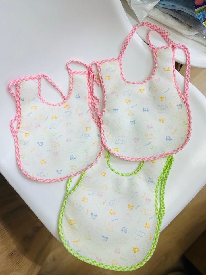 Renkli nakış desenli beyaz bebek önlükleri, pembe ve yeşil örgü kenarlarla. Yumuşak ve kullanışlıdır. 3 adet fiyatıdır