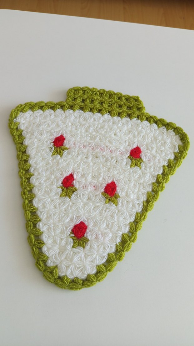 Beyaz taban üzerine renkli nakış detayları ve yeşil bordür ile tasarlanmış özel şekilli lif