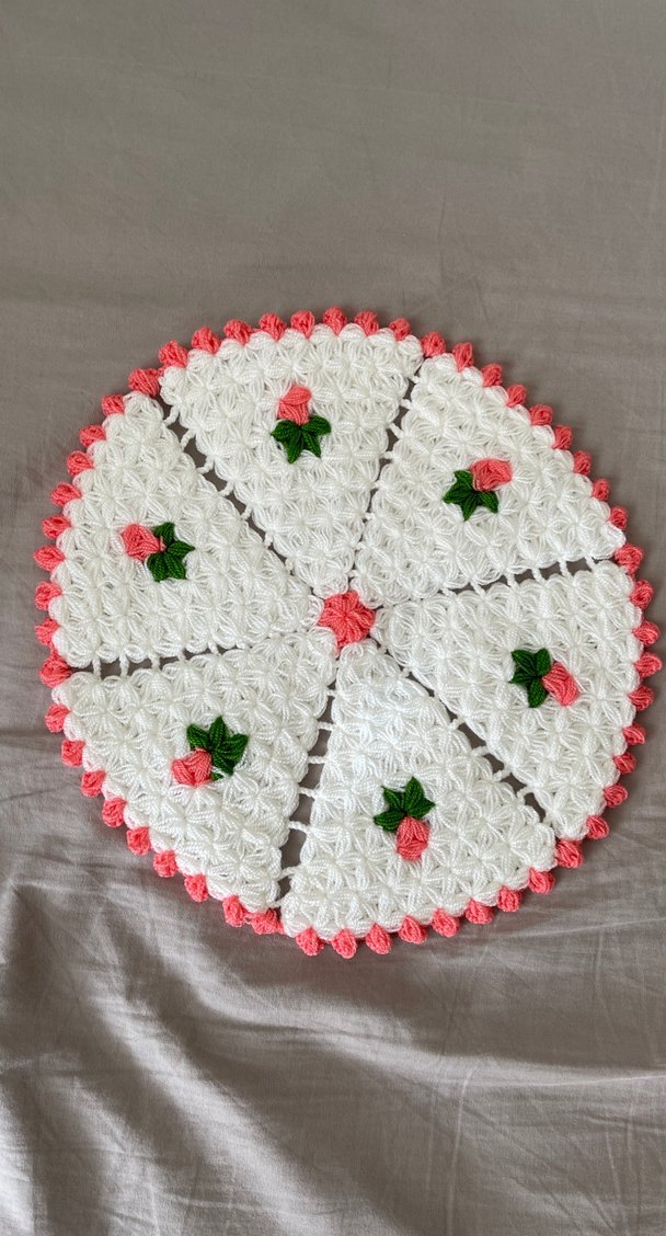 beyaz zemin üzerinde renkli nakışlı çiçek desenleri ve pembe bordürlü banyo lifi