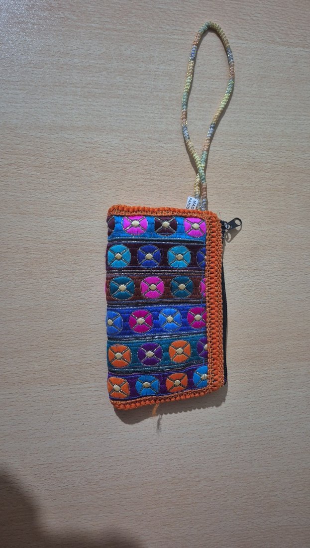 Renkli nakışlı örme kumaştan, fermuarlı ve bileklikli bohem kadın cüzdanı. Günlük kullanıma uygundur.