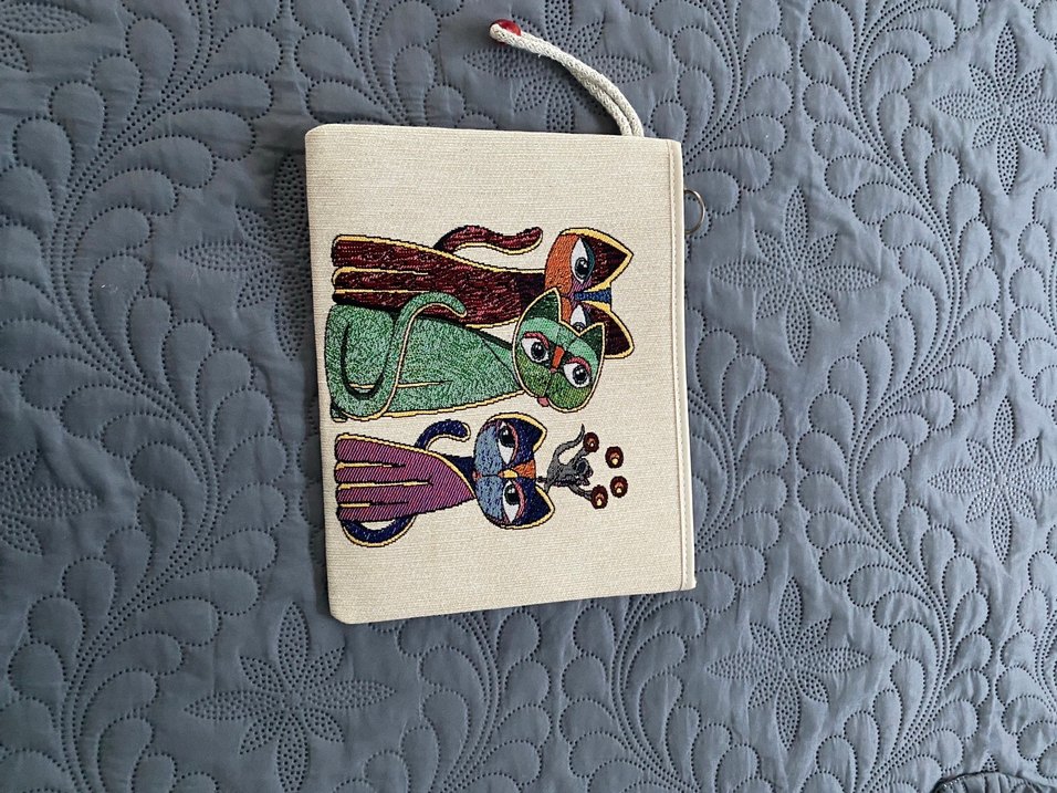 Nakışlı kedili, renkli bohem tarzı kadın portföy çanta. Kumaş malzemeden, fermuarlı ve günlük kullanıma uygun.