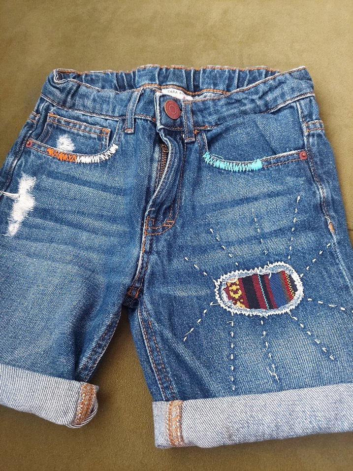 Mavi kot şort, renkli nakış detaylarına, bol kesime ve ayarlanabilir bel bandına sahiptir. Temiz ve orjinaldir