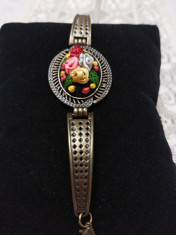 Bu bohem bileklik, vintage tarzı metal bant üzerinde renkli nakışlı çiçek desenleri ve düğüm detayları içerir. Aparat rengi antik sarıdır.Günlük kullanıma uygundur. Ürün el yapımı olup sıfır üründür.Marka temsilidir.