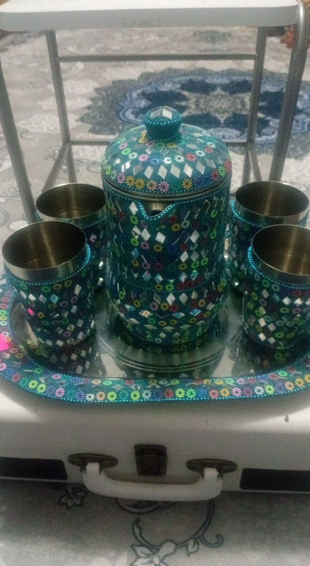 Nakışlı desenlere sahip, renkli lidded kap, dört bardak ve tepsiden oluşan geleneksel tarzda çay seti.