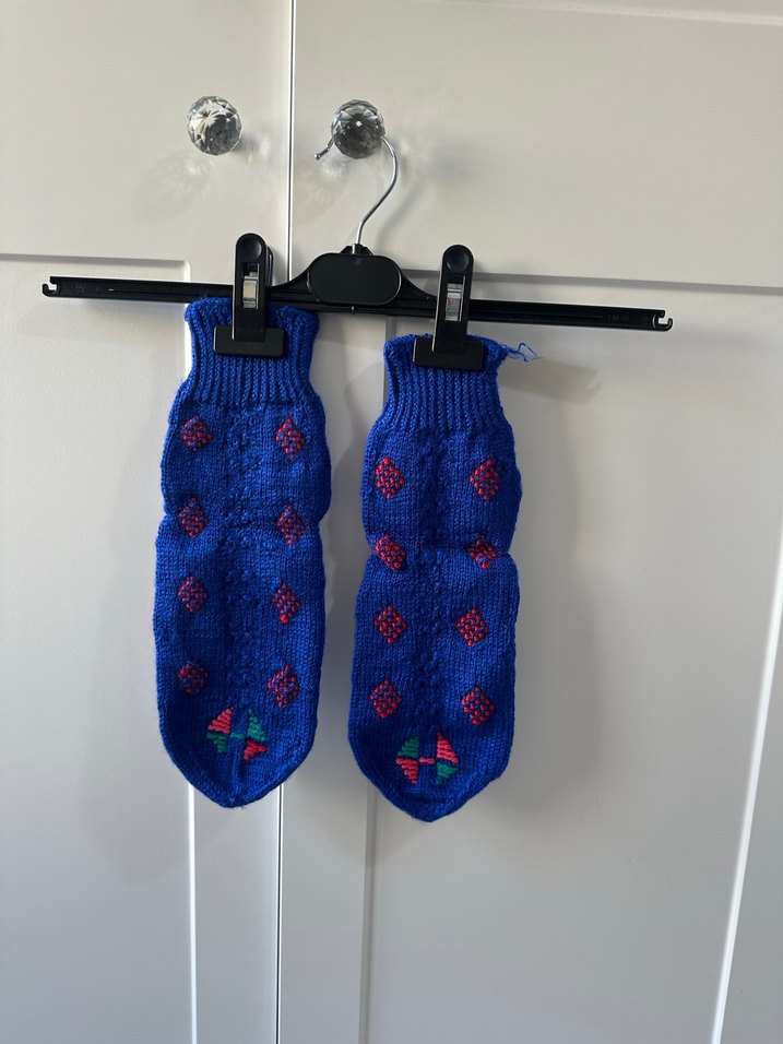Yumuşak örme kumaştan yapılmış, renkli nakış desenlere sahip mavi erkek çorapları.