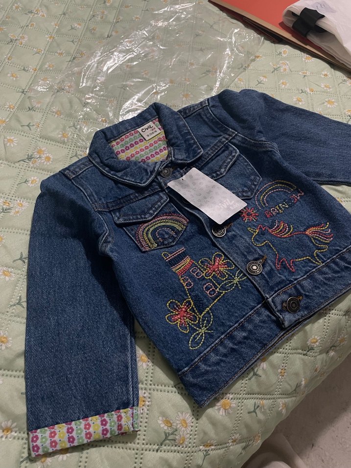 Kız bebekler için renkli nakışlı kot ceket, düğmeli ön ve kesik yaka detaylıdır. Regular fit ve bohem tarzda, sokak modasına uygun.