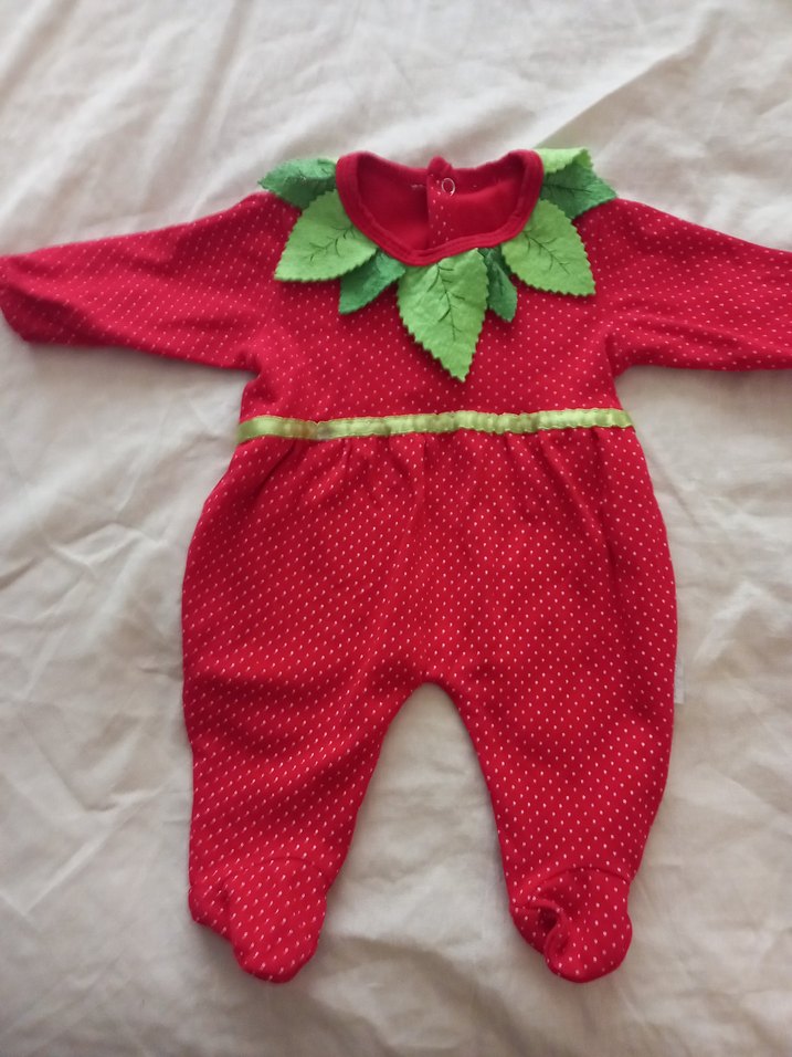 Kırmızı renkli, nakışlı ve yaprak yaka detaylı kız bebek tulumu.