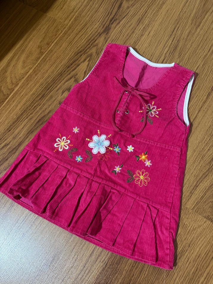 Pembe renkte, kolsuz, nakış işlemeli çiçek detaylı, bol kesim ve fırfırlı etek uçlu kız çocuk elbisesi.