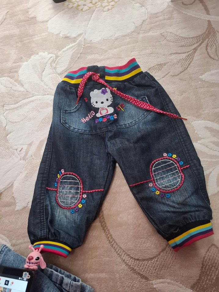 Nakışlı, renkli detaylara sahip,lastikli çizgili manşetleri olan kız çocuk kot pantolon.