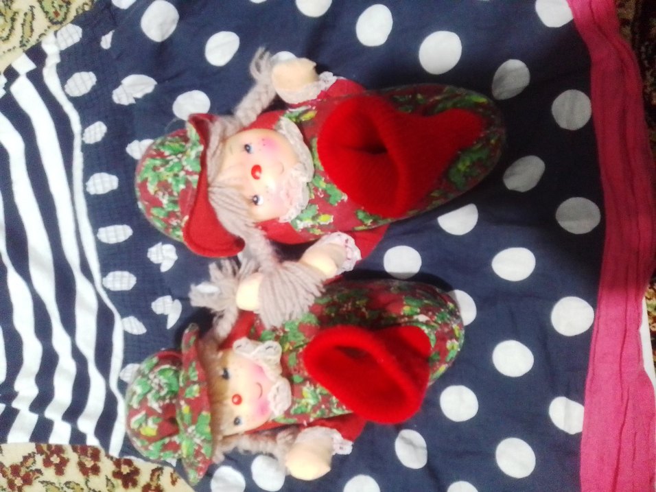 Nakışlı detaylara ve örgü tasarıma sahip renkli kız çocuk sıcak ev terliği. Yumuşak ve sıcak kumaştan yapılmış, geleneksel tarza sahip oyuncak bebek süslemeleri içerir.