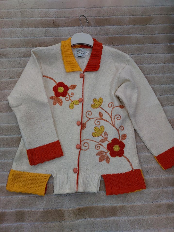 Beyaz örme hırka, renkli nakışlı çiçek desenleri, uzun kollu ve bol kesimdir. Canlı turuncu ve sarı renklerde ribanalı manşet ve etek ucu bulunur.