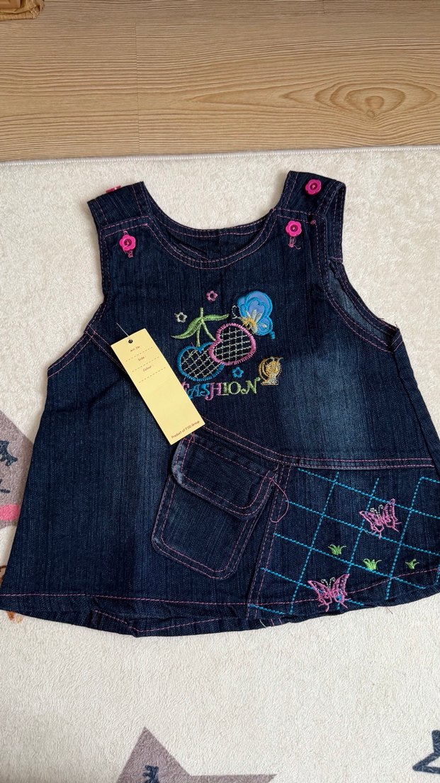 Mavi kot kumaştan, renkli nakışlı, düğmeli ve yuvarlak yaka, salaş kesim kız elbisesi. Sokak stiline uygun rahat bir model.