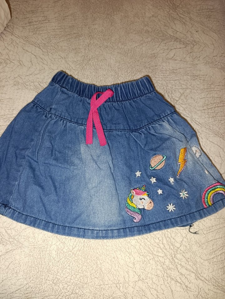 Nakışlı desenlere sahip renkli kot kız eteği, düğmeli detaylı ve rahat kesimlidir, günlük sokak modasına uygundur.
