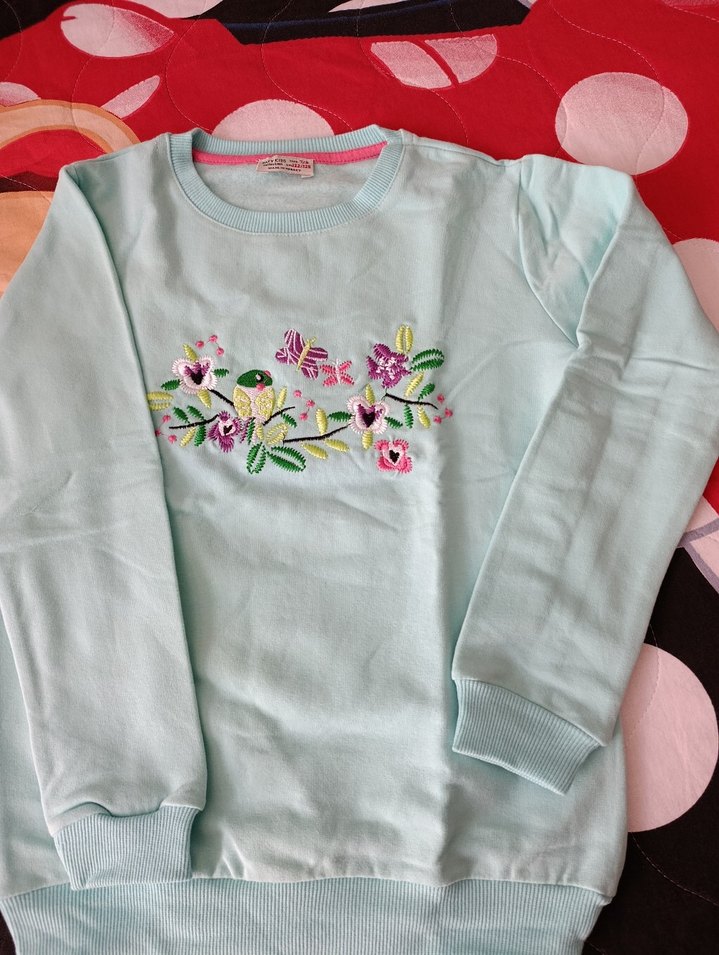 Pamuk kumaştan, uzun kollu, bisiklet yaka ve bol kesim kız sweatshirtü. Renkli nakışlı çiçek desenleri ve örme detaylar içerir. sadece bir kez giyildi yumuşacık bir kumaşı var rengi su yeşili ve fotoğraftan daha canlı bir renge sahip