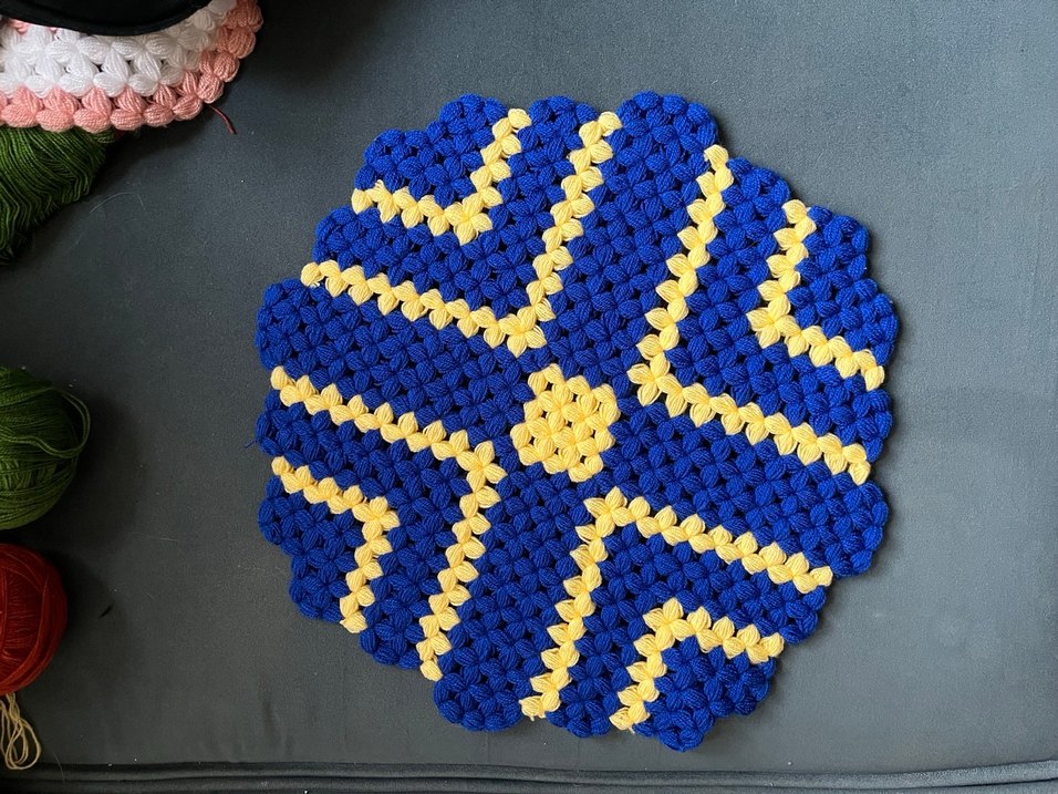 Nakışlı desenli, canlı mavi ve sarı renklerde renkli ve dokulu banyo lifi. El yapımı.