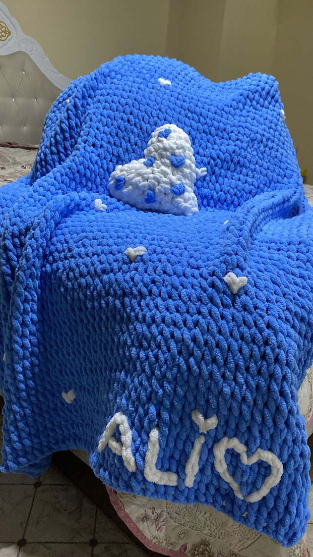Nakışlı kalp ve isimli yazılı renkli mavi battaniye, kalın dokusuyla sıcaklık ve konfor sağlar isteğe göre yapılır