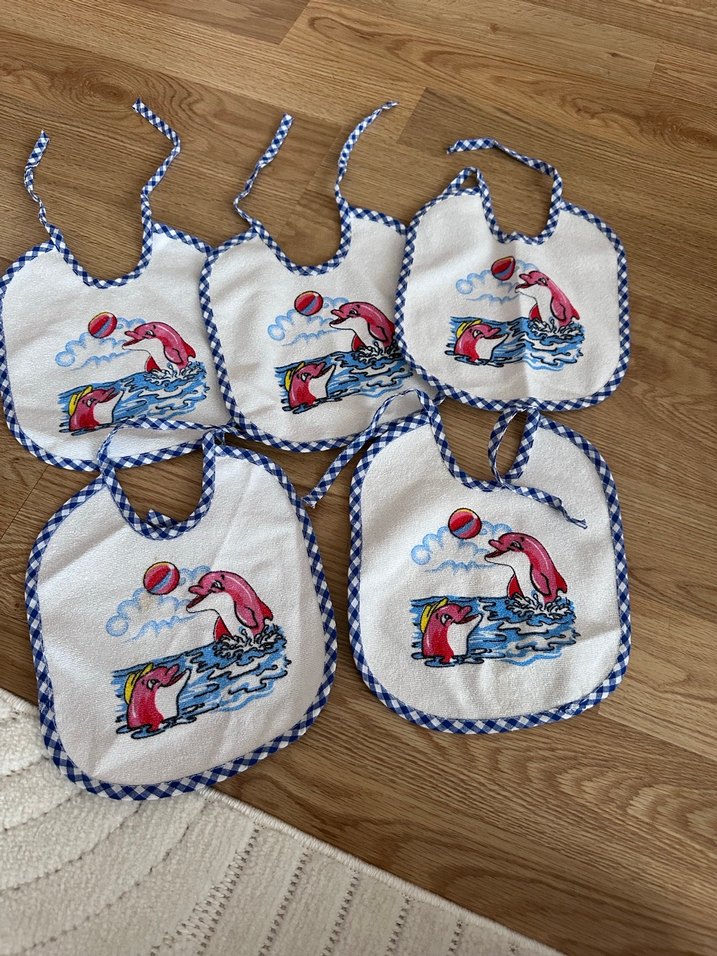Nakışlı yunus ve top desenli renkli bebek önlükleri, mavi kareli kenar ve bağcıklarla. Beslenme için yumuşak ve kullanışlı.