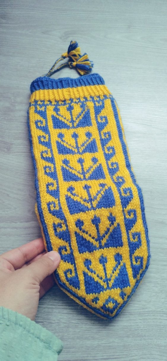 Nakışlı, mavi ve sarı renklerde geleneksel desenli namaz corabi veya erkek patigi.