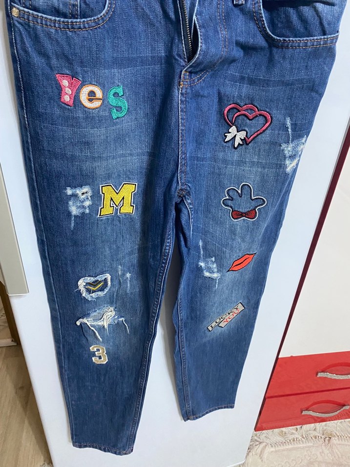 Renkli nakışlı desenlere sahip, düğmeli ve bol kesim mavi kot pantolon. Normal boyda, günlük sokak stiline uygun. 2 tarafında yırtık modelli var 38/40 beden olur