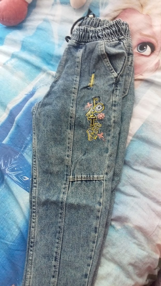 Renkli nakış detaylı, düğmeli, bol kesim mavi kız denim pantolon. Trend sokak stili için uygundur.