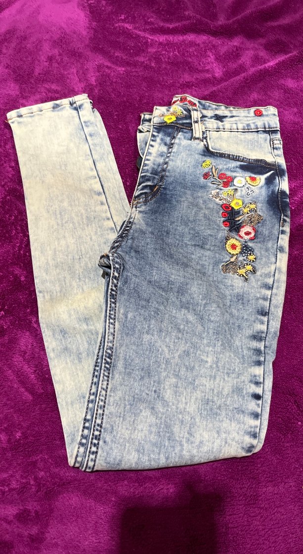 Renkli çiçek nakışlı, düğmeli, vücuda oturan midi boy kot pantolon, günlük sokak modası için uygun.