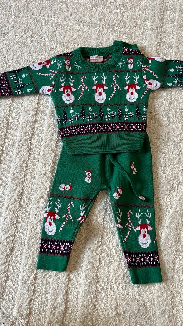 Nakışlı noel temalı renkli örgü bebek erkek takımı, uzun kollu ve yuvarlak yakalıdır. Street wear tarzına uygundur. Yılbaşında bir kez giyildi tertemiz