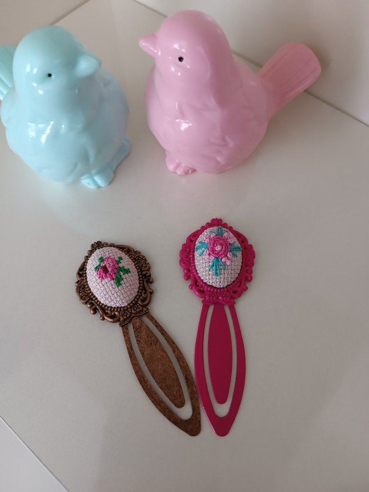 Nakışlı çiçek desenli, pembe ve kahverengi tonlarında renkli, uzun ve fıtilli kitap ayraçları. Okumalarınıza dekoratif bir dokunuş katar.