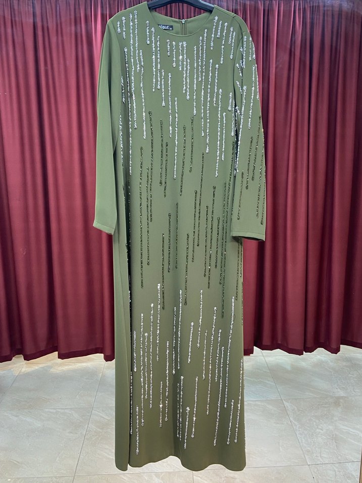 Haki renkte, sentetik kumaştan uzun ve salaş kesim elbise. Uzun kollu ve bisiklet yaka, parlak nakışlı desenlerle süslenmiş, dökümlü ve çağdaş bir tasarıma sahip. ✨ 42,44 beden uyumlu sıfır abiye