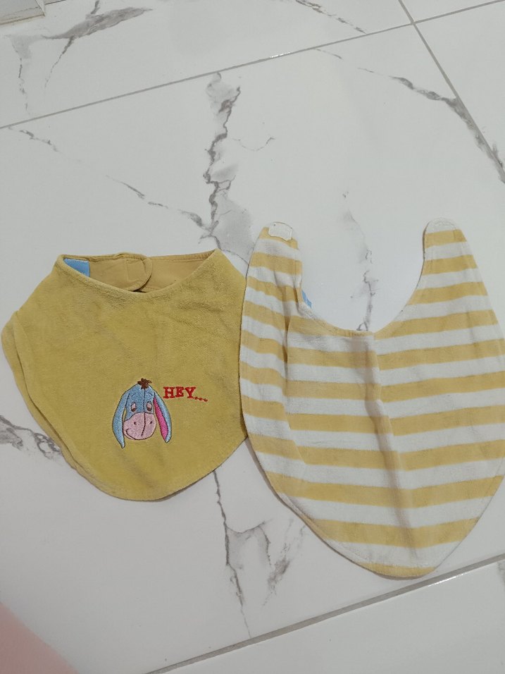 Nakışlı ve "HEY" yazılı pastel sarı bebek önlüğü. Çizgili ve düz desenli, yumuşak kumaşlı. Az kullanıldı sadece iç kısmında defolar mevcut