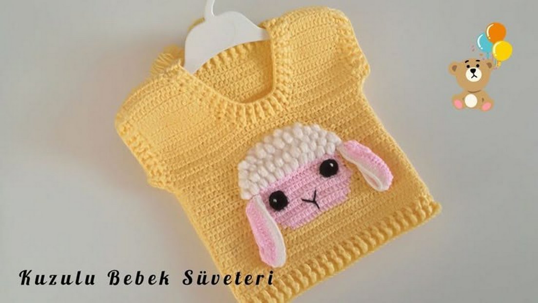 Pastel sarı renkte, nakışlı kuzu figürlü yumuşak dokulu bebek önlüğü. 0-6 aylık bebeklere uygundur