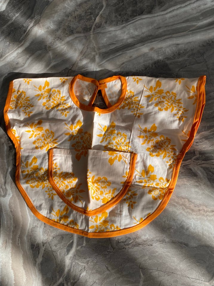 Nakışlı sarı çiçek desenli, yumuşak kumaştan yapılmış ve turuncu kenarlıklı bebek önlüğü. Önde cep ve bağlama detayı bulunur.