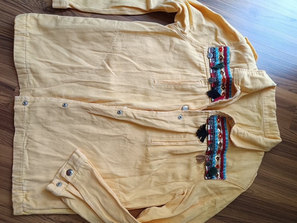 Uzun kollu, yakası kesikli, nakış detaylı açık sarı kadın gömlek. Bol kesim ve düğmeli, günlük kullanıma uygun bohem tarz.