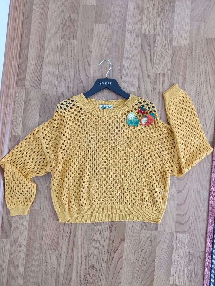 Standart beden. Sarı renkli, uzun kollu, yuvarlak yakalı, bol kesim kısa triko kazak. Renkli nakış detaylarıyla günlük sokak stiline uygun.
