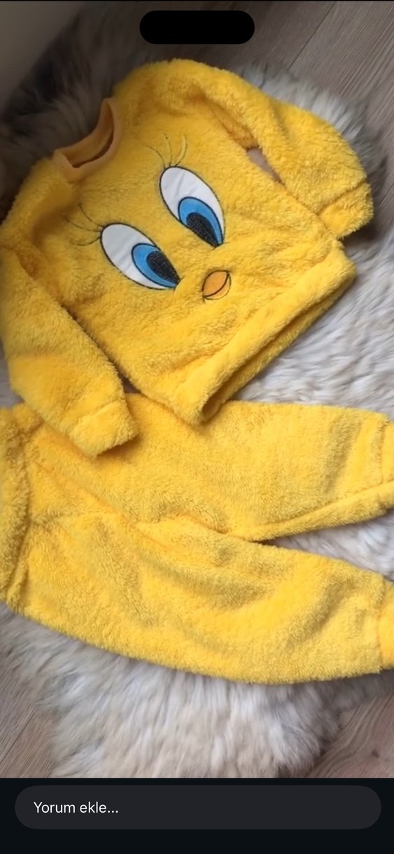 Nakışlı detaylara sahip, yumuşak ve sıcak dokulu sarı kız çocuk bornoz takımı.