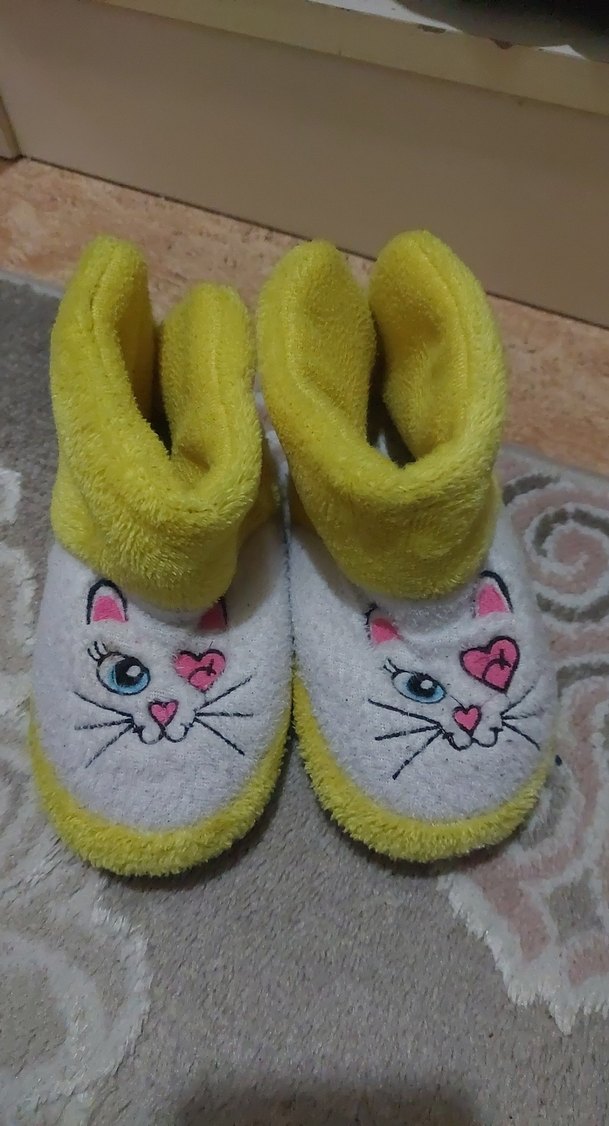 Yumuşak tüylü kumaştan, nakışlı renkli kedi desenli sarı kız çocuk ev terliği.